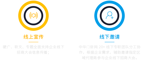 中華門窗網(wǎng)針對(duì)于企業(yè)線下招商大會(huì),提供線上招商宣傳以及線下精準(zhǔn)代理商邀請(qǐng)服務(wù),全力配合招商會(huì)的落地與轉(zhuǎn)化。